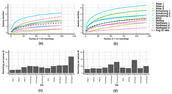 A total of 55 unique bird vocalization patterns were identified throughout all sites using the BIO and Dawn methods of species identification (Table S1). Of these, 45 were identified to species and 10 were not. Unidentified unique vocalization patterns were counted as additional species but marked as unknown. Species lists are provided in the Supplementary Materials (Tables S2 and S3). The BIO sorted rank method identified between 3 and 16 unique vocalizations at each site, while the dawn method identified between 4 and 22 (Figure 5). The number of recordings needed to add one species was approximately 38 and 39, for the BIO and Dawn methods respectively, suggesting similar outcomes regardless of method. Results of both methods were correlated (Pearson’s R = 0.72). The Dawn method was chosen over BIO for further research because it was taken from a more consistent timeframe than the BIO samples, and offered greater discrimination among sites as is seen in the spread of number of species identified by BIO and Dawn in Figure 5a,b. Individual site SACs are provided in Figure S2 with error bars that demonstrate the range in species number identified given listening effort with random reordering of recording samples.