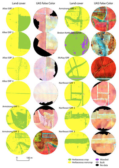 UAS land cover maps and false color images. No data values in raw images were the result of inadequate photographs for computer vision mosaicking. These areas were compared with the 2018 USDA Copland Data Layer [30] and manually reclassified as herbaceous noncrop.