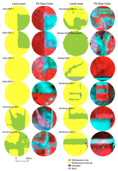 The 1 m resolution UAS imagery and 3 m PS imagery were used to produce separate land cover maps. A simple five class land cover classification system was used to differentiate distinct features in agricultural landscapes: herbaceous noncrop, herbaceous crop, woody, built, and water. The herbaceous noncrop class represents all non-woody vegetation that is not a row crop. The herbaceous crop includes all row crops, which at our study sites are corn and soybeans. The woody class represents all trees and shrubs. The built class represents all infrastructure including roads. The water class represents all open surface water. After classification, woody cover was combined with herbaceous noncrop cover to create a noncrop vegetation class. Noncrop vegetation is therefore defined as the combination of all herbaceous noncrop and woody vegetation cover, some amount of which might include woody crops, though these are rare in the Iowa Corn Belt. Ground truth data were collected using geo-tagged smartphone photographs and were accompanied by descriptions of plant species observed and then cross-referenced with an online map reference (Google earth) to guide delineation of training polygons for both UAS and PS imagery. Seventy percent of the pixels within the training polygons were randomly extracted and applied to the training algorithm, with the remaining 30 percent used to test model performance. The linear support vector machine (SVM) classifier within the Caret package in R [32] was used to map land cover classes, which were then applied to the imagery using the Raster package [33]. The SVM was parametrized using a linear kernel with 5 K-fold cross validation. SVM is a widely used classifier in grassland remote sensing because of its ability to detect variation of spectral reflectance in homogenous vegetation patches with improved performance in grassland systems with increasing temporal resolution [34,35].