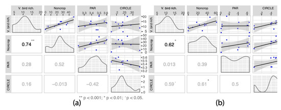 Correlations, data distributions, and scatterplots between vocalizing bird richness and landscape indicators, illustrating greater correlation for the noncrop indicator and cross-correlation of other indicators using both (a) UAS and (b) PlanetScope (PS) land cover data with outlier BKG removed (N = 11). Density plots are in the diagonal positions. Scatterplots on the upper right side include the black line fitted with a linear model gray shading as 95% confidence intervals. Labels are: V. bird rich.—vocalizing bird richness; Noncrop—proportion (%) of noncrop vegetation; PAR—perimeter area ratio; CIRCLE—circumscribing circle index.