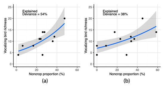 There were several UAS data points (Armstrong 2, Armstrong 3, McNay, Northeast 2, Northeast 3) where vocalizing bird richness ranged from 4 to 14 while noncrop vegetation proportion remained approximately the same (about 25%; Figure 9a); a clear indication that unobserved factors may be influencing results. For example, management actions such as mowing or pesticide application at a site may be more influential to vocalizing bird richness than the total proportion of habitat available. This may also be related to the use of a highly simplified land cover classification which was used to reduce complexity in the analysis, allowing our focus on the central objective of the study. However, the management of farmland mosaics is diverse, even across the intensively managed agricultural regions of Iowa, and this influences the degree to which landscape elements, such as hedgerows and linear features, can provide functional habitat for wildlife [47,48].