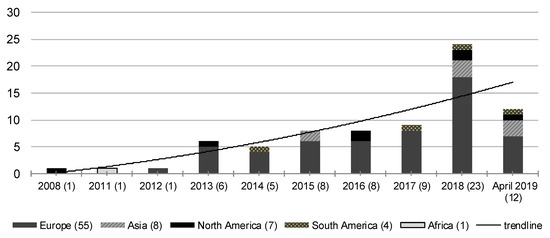 The results show a rise in research interest in this area. In particular, the growing numbers of articles, especially since the year 2018, as well as the trend line confirm the increasing significance of this topic (see Figure 2). Already in the first four months of 2019, more than 50% of the previous year’s total number of publications on the investigated topic had been published. The review still confirms the finding of Haase et al. [14] that most studies are carried out in European cities. Due to the higher numbers of publications in the last two years, it can be assumed that the topic is still evolving as a research field and that more studies will be published in the future.