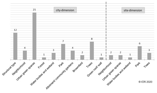 Figure 3 shows the number of investigated green infrastructure types at city- and site-dimensions in the reviewed publications. In general, the articles investigated a wide range of green infrastructure types. It can be seen that the majority of the studies analyzed ES at city-dimension (Figure 3, left side), especially in regard to “urban green spaces” and “structural types” with a much smaller number of studies analyzing single structures in cities (Figure 3, right side). The two dimensions show a similar number of assessments of “parks”.