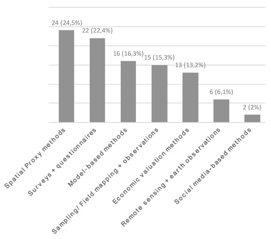 Furthermore, we identified seven different categories for the method classification of all reviewed articles (cf. key question 3). These categories are as follows: “spatial proxy methods”, “samplings/field mapping and observations”, “surveys and questionnaires”, “economic valuation methods”, “model-based methods”, “social media-based methods” and “remote sensing and earth observations” (see Supplementary Materials (S2) for a detailed description of the categories).