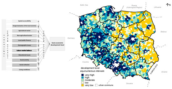 The analysis was carried out for rural areas in Poland, which show great territorial differences in the socioeconomic development level. This is the effect of historical (19th and 20th centuries) circumstances related to Poland being partitioned among three powers (Russia, Prussia and Austria) as well as socialist state policies for rural areas that were pursued until the fall of communism in Central and Eastern Europe in 1989 [18]. Efforts to make up for infrastructural backwardness in rural Poland did not really take off until the country joined the EU in 2004. The social and economic structure of rural areas is still heavily influenced by the economic power of regional cities, which drains the demographic potential from areas far from urban centres. The scale of these differences is well illustrated by the results of research conducted in Poland as part of the Rural Development Monitoring (MROW) project [19,20] (Figure 1). In order to see the true scale of these differences, it is advisable to consider the lowest level of spatial aggregation, i.e., the local structure. In Poland this requirement is met when data are considered for the gmina/commune (local administrative unit) level, based on the current administrative division (in this case from 2019), taking into account rural communes and the rural segments of urban-rural communes (2175 local administrative units—LAUs). By “rural areas” in Poland we mean areas lying outside the administrative boundaries of towns/cities [21].