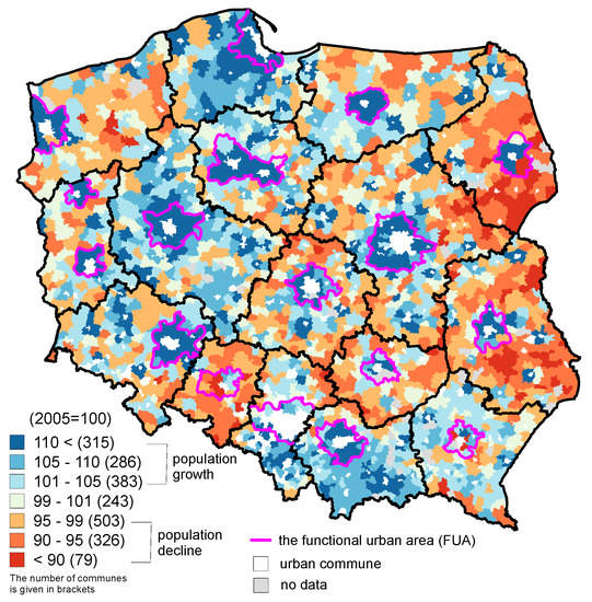 Population changes recorded since Poland’s accession to the EU deepen the tendencies observed for the beginning of the country’s urbanisation process, which accelerated in the 1950s [30]. Areas where the population is increasing cover about one-third of rural and urban-rural communes in Poland and these are mainly suburban zones around large regional centres. Nearly 90% of communes located within the boundaries of functional urban areas (FUAs)3 in provincial capitals show the highest population growth. These are areas of long-term immigration.