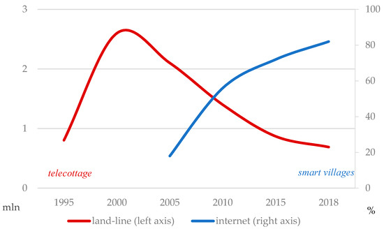 In the following years the Swedish idea was adapted elsewhere, initially in the Nordic countries and later also in the west of Europe and in Hungary. In the mid-1990s Poland also saw a similar initiative, involving a telecommunications centre in Kujawsko-Pomorskie province, but the idea was never put into practice [40]. It seems that 30 years ago it was a concept which in Poland’s case was ahead of its time, especially in terms of infrastructure requirements. It was not until the late 1990s that rural areas were speedily supplied with land-line telephones, but then other technologies (computers, mobile phones, the internet) rapidly supplanted this form of communication [42]. The evolution of telecommunications in rural Poland is shown in Figure 4.