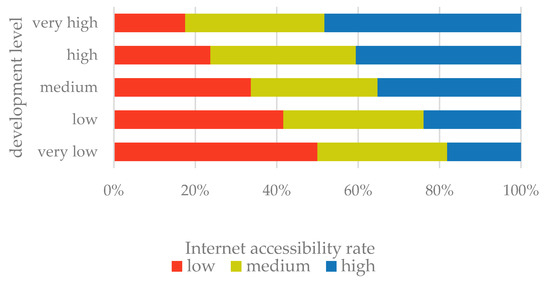 The interdependence of the accessibility of internet infrastructure and the level of socio-economic development has been confirmed statistically. Spearman’s rank correlation coefficient is rho = 0.300 and is statistically significant (cf. Figure 1 and Figure 5). It is not a strong interdependence; however, it should be remembered that it is calculated for the full set of communes (N = 2175). It is therefore justified to conclude that with the increase in the level of development, the provision of ICT infrastructure in rural areas also increases. The verification of this relation in five development levels (as in Figure 1) has shown that only one in five communes with a low or very low level of development have a high level of internet accessibility. However, one in two of the communes in the category with high and very high levels of development also have the highest level of internet accessibility (Figure 6).