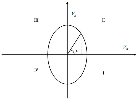 Because the evolution rate of the socioeconomic benefit system fits the S-shape mechanism [56,57], we assume it changes periodically. Meanwhile, the evolution rate of the ecological environment benefit system also changes periodically due to the effects of the socioeconomic benefit system [58]. In each period, the change in is caused by and , so we can analyze by projecting the evolution trace of and onto the two-dimensional plane formed by (,). The eventual projection is an ellipse because the maximum evolution rate of the socioeconomic system is greater than that of the ecological environment system in extreme conditions [53], as shown in Figure 3. Variable represents the angle between and , and is subject to: