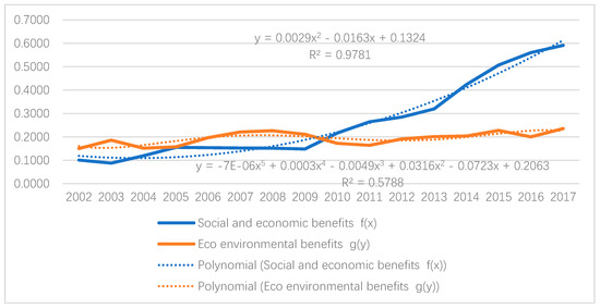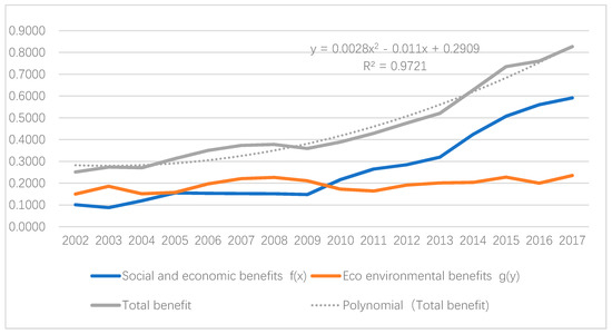 As shown in Table 4, the socioeconomic benefit fluctuated around 0.1 from 2002–2004, then around 0.15 after a growth to 0.1552 in 2005, until the steady growth from 2009–2017 to 0.5914, by a total of 0.4435, and an annual growth rate of 14.7%. From 2005–2009, the change in socioeconomic benefits slowed down, mainly due to the fact that the development of the city’s infrastructure lagged behind, while the economy grew rapidly. As a result, the overall change in benefits was insignificant. The huge subprime lending crisis significantly impacted economic benefit. Nevertheless, with the establishment of the Western Taiwan Straits Economic Zone, the Western Taiwan Strait strategy being upgraded to a national strategy, and the cross-strait relationship developing towards peace, Xiamen narrowly escaped the economic crisis. After 2009, Xiamen’s socioeconomic benefits grew rapidly. The ecological environment benefits of land use rose with fluctuations between 2002 and 2017, by a total of 0.0853. From 2002–2009, the ecological environment benefits were higher than the socioeconomic benefits and were increasing, reaching the highest in 2008, thanks to the transition of Xiamen’s economic structure and emphasis on environmental protection. To prepare for the 2008 Olympic Games and to consolidate and deepen the results of obtaining the title of National Environmental Protection Exemplary City, Xiamen City enforced a plan to do so, outlining the division of responsibilities among each department of the city government and lower-level governments. Environmental protection was taken into the evaluation of the city mayor and the district governors. The ecological environment benefit peaked in 2008, then saw a brief decrease, and restored slow growth after 2011. Due to the 2011 Xiamen City Regulation on Power Saving, the new environmental protection regulation coming into force had positive effects on the public environment and indirectly influenced residents’ environment-related behaviors [60]. After 2011, industrial wastewater, as well as gas and solid per unit area decreased annually and the ecological environment benefits increased but was still slower than the growth rate of socioeconomic benefits. Since then, the socioeconomic benefits of land use have been higher than the ecological environment benefits, with a widening gap. From 2002–2017, the overall benefit of land use was increasing, and the growth rate was also increasing, fitting a quadratic curve.