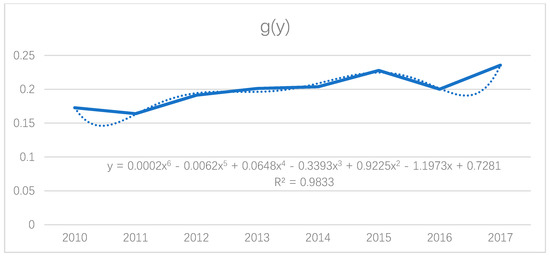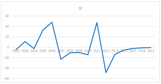 where t ranges from 1 to 16, corresponding to the years 2002–2017, respectively, when , . According to Equation (17), we get α and plot the evolution curve. The results are shown in Figure 8.