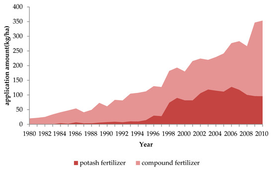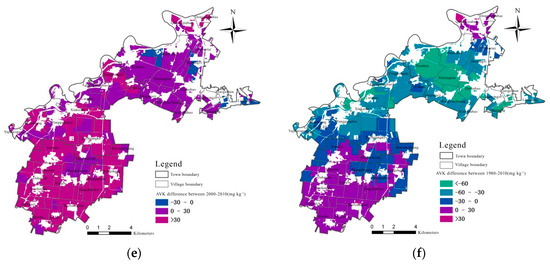 - Although the AVK content of the soil in the study area has a largely downward trend in the past 30 years, there are different trends in different stages. This variation can be attributed to to the gradual evolution of households’ land-use behaviors. From 1980 to 2000, the average value of AVK decreased from 149.56 mg/kg to 103.52 mg/kg, due to the underdeveloped economy, limited investment capacity, technology level, and management level, as well as the plunder of cropland. After the year 2000, with the acceleration of the urbanization process and driven by economic interests, households gradually seek to maximize profits by increasing agricultural production. This was achieved by improving potassium use management: the use of potassium soil test, potassium nutrient budgeting, and the increasing use of potassium fertilizers. As a result, the average of AVK rose to 134.27 mg/kg in 2010 with an increased rate of 29.70% compared to the year 2000.