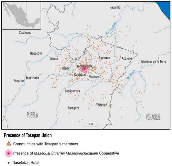 Figure 1 shows the presence of cooperatives throughout the northwestern highlands. This weighty network was achieved through actions, such as the “own communal policy”, steered by their members to increase the quality of life of Indigenous people, which were widely adopted by several communities in the region [35]. Nowadays, Tosepan incorporates eight regional cooperatives and three associations, each specialized in different areas. Currently, a total of 34,000 families are affiliated with the organization, mostly Nahuas and Totanacas, and it encompasses 410 local cooperatives from 28 different municipalities of the State of Puebla [35].