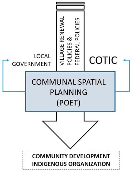 Indigenous organizations in Cuetzalan face multi-dimensional challenges, such as predatory capitalist neoliberal trends that transform identity and culture into merchandise for the global market. Accordingly, this paper questions the benefits of village renewal policies based mainly on competitive tourism and the homogenization of Mexican culture through the Federal Program “Pueblos Mágicos”, which perpetuates the condescending approach of social policies. The result is a policy that segregates a vulnerable local population in their own environment. On the other hand, Masehual and its women have appeared as key detonators of socio-political and community development. Additionally, the community complements common good organizations making use of instruments for communal spatial planning, such as the Environment and Land Management Program for Cuetzalan (Programa de Ordenamiento Ecológico y Territorial, hereinafter POET) while dissenting land and tourism policies.