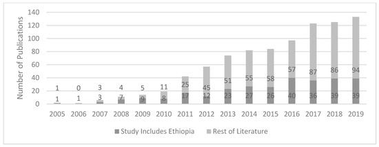 We narrow down the global literature and focus on a specific country, Ethiopia, which has been subject to significant land deals (1.4 million ha concluded, 0.5 million ha intended, 0.4 million ha failed) and has also been subject to significant research (see Figure 1). In the early 2010s, when data was particularly challenging to obtain, the amount of land leased in Ethiopia ranged from 602,760 to 3.6 million ha [10,11]. While the more moderate assessments look more accurate in retrospect, this is only if one does not take into account intended and failed contracts, which by the Land Matrix’s low estimate involved 1 million hectares. One can view the discrepancies of data, and specifically underreporting of deals on the Land Matrix, by comparing the data presented in the Land Matrix from 2000 to 2018, as in Dejene and Cochrane [12], with the government data, and as reported in Baumgartner et al. [13], for the period 1992–2010. As we detail below, approximately one-fifth of the publications rely directly on the Land Matrix for data on land deals, while another set of publications relies indirectly on the Land Matrix database by citing other publications that did, thus making the Land Matrix a key evidence base for researchers. We note that high-profile companies within Ethiopia, such as MIDROC, have been thoroughly documented, as have investors that gained significant media attention, such as Karuturi. However, the result is that less well-known investors and investments have not been researched or reported to the Land Matrix.