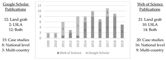 Analyzing the trends of publications over time, those identified through Google Scholar (reports, dissertations, non-indexed journals) were particularly important in the early years of research (2009–2013) and thereafter the Web of Science-indexed material became more numerous (see Figure 2). The Google Scholar results in the period 2009–2013 tended not to be peer reviewed and therefore had a faster publication timeline (more than half of the early publications were reports or conference presentations). Analyzing the keyword searched that identified the literature, “land grab” was the most common framing of the research (47% for Web of Science, 46% for Google Scholar), followed by literature that utilized “land grab” and “large-scale land acquisition” (31% for Web of Science, 46% for Google Scholar), while a smaller amount only utilized the “large-scale land acquisition” framing (22% for Web of Science, 8% for Google Scholar). Of note, when assessing the literature for false-positive results, research that only used one of the terms had relatively higher numbers of false positives (10 for land grab, 8 for large-scale land acquisition), whereas of the literature that utilized both, there were only two false positives. In the Web of Science literature, the literature that only utilized “large-scale land acquisition” as its framing tended to be rooted in the natural sciences, whereas the ‘land grab’ literature drew more heavily on the social sciences.