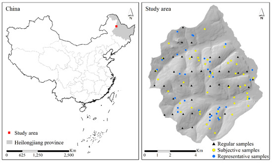 There were 115 soil samples in the study area (Figure 1). Soil samples were collected in 2005 from three sampling strategies, including integrative hierarchical stepwise sampling, subjective sampling, and systematic sampling. Thirty-two representative soil samples were collected using the integrative hierarchical stepwise sampling strategy, which aimed to collect representative samples to represent soil spatial variation by clustering environmental covariates and identifying samples based on the clustering results [30]. Slope, topographic wetness index, plan curvature, and profile curvature were used for identifying samples. Forty-four subjective samples were collected using the subjective sampling strategy, which means that experienced soil survey experts located them. Thirty-nine regular samples were collected using the systematic sampling strategy and were distributed on a grid of 1100 m (south-north direction) by 740 m (east-west direction).