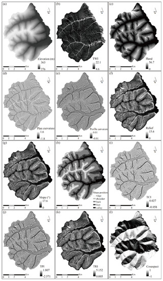 The topography is the dominant factor for spatial distribution in soils across the study area. The area is small, and its parent material and climate are generally homogeneous. A digital elevation model (DEM) with a spatial resolution of 10 m resolution was produced from a topographic map at a scale of 1:10,000. The DEM was interpolated via irregular triangular networks, which comes from contour lines in the topographic map. Based on the digital elevation model, a total of twelve environmental covariates were derived and used as follows: elevation, topographic wetness index (TWI), height above the nearest drainage (Hand), plan curvature, profile curvature, relief, slope, slope position, terrain characterization index (TCI), topographic position index (TPI), terrain ruggedness index (TRI), cosine value of the aspect (cosaspect) (Table 1, Figure 2a–l). The slope position was classified into five classes, including ridge, shoulder slope, back slope, foot slope, and valley [31].