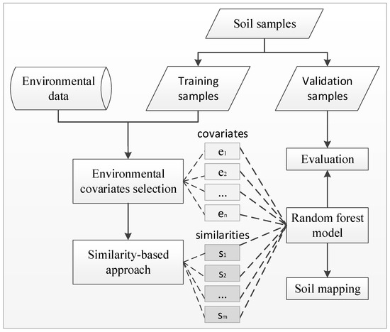 To take the advantages of both the random forests and the similarity-based approach, and provide a high-quality feature set and improve the accuracy of DSM, an integrated method is proposed in this paper. The objectives of this study were to (i) present an approach for soil mapping by integrating the similarity-based approach and the random forests method; and (ii) demonstrate the ability of the developed method to map soil subgroups in comparison to the two methods before integration.