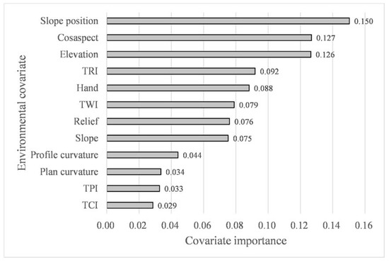 Figure 4 shows the ranked importance of environmental covariates for covariates selection. The larger the value of a covariate, the more important it is. A total of twelve factors were involved in the environmental covariates selection in this study. Out of these covariates, slope position has the highest value (0.15), followed by cosaspect (0.127), elevation (0.126), TRI (0.092), Hand (0.088), TWI (0.079), relief (0.076), and slope (0.075), respectively. Profile curvature, plan curvature, TPI, and TCI in the study area have lower covariate importance values, all of which were less than 0.05. Therefore, these four covariates were removed, and the top eight covariates with the highest importance value were selected for digital soil mapping.