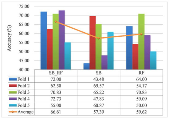 Figure 6 presents the performance of each model for the 5-fold cross-validation. It can be observed that the overall accuracies of SB-RF, SB, and RF ranged from 55% to 72.73%, 43.48% to 69.57%, and 54.17% to 70.83%, with an average accuracy of 66.61%, 57.39%, and 59.62%, respectively. The SB-RF model has a significant improvement in accuracy over the SB and RF, which shows the superiority of the integrated method again. The comparison between the RF and SB-RF demonstrates the effectiveness of the similarity feature set. In general, the accuracy of each model in the case using 5-fold cross-validation, compared with the case using regular samples as the validation dataset, has changed notably. However, the research can still prove the superiority and effectiveness of the proposed integration method.