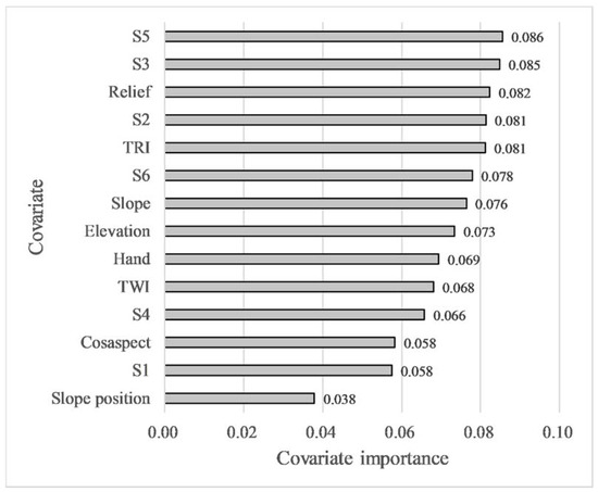 Figure 7 exhibits the importance ranking of covariates in the SB-RF model. A total of fourteen covariates, including eight selected environmental covariates and similarity covariates of six soil subgroups (S1, S2, S3, S4, S5, S6), were involved in the calculation of covariate importance. The S5 achieved the best covariate importance value (0.086), followed by S3 (0.085), relief (0.082), S2 (0.081), TRI (0.081), S6 (0.078), slope (0.076), elevation (0.073), Hand (0.069), TWI (0.068), S4 (0.066), cosaspect (0.058), S1 (0.058), and slope position (0.038), respectively. Compared with the results of covariates selection, the importance ranking of covariates has changed considerably after adding six similarity covariates. Similarity covariates occupied four of the top ten most important covariates, and S1 and S2 were the top two. The results indicate the importance and value of the similarity covariates.