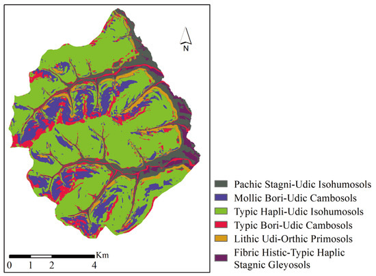The soil type of each soil sample was defined by soil experts according to soil horizons characteristics, profile properties, and Chinese soil taxonomy [40]. There are six categories in the Chinese soil classification system: order, suborder, group, subgroup, family, and series. The soil subgroup was taken as the target soil type in our study. There were six subgroups in the area: Pachic Stagni-Udic Isohumosols, Mollic Bori-Udic Cambosols, Typic Hapli-Udic Isohumosols, Typic Bori-Udic Cambosols, Lithic Udi-Orthic Primosols, and Fibric Histic-Typic Haplic Stagnic Gleyosols, which correspond to Aquic Cumulic Hapludollsy, Humic Eutrudepts, Typic Hapludolls, Typic Eutrudepts, Lithic Udorthents, and Histic Humaquepts or Typic Epiaquepts in the U.S. soil taxonomy [41].