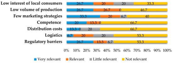 In order to identify the factors which currently hamper the scaling up of the SFSCs, the following figures represent the evaluations made by the producers interviewed concerning the inconveniences which exist for the commercialization of their produce using SFSCs. For Malaga (Figure 1), the most relevant factors are the need to differentiate themselves from the big organic farms (56.1%) and the distribution costs associated with the SFSCs (49.2 %), while in Granada (Figure 2), the main obstacle which has been identified is the lack of marketing strategies used to get to know their produce (33%). If we consider the grouping of all the sample data on the problems indicated as being highly relevant, it is important to highlight the fact that they need to differentiate themselves from other organic companies and producers (38.05%) despite the fact that this deals with a smaller group of agents. Next in importance is the low level of interest shown by local consumers and insufficient demand (29.6%), distribution costs (28.1%), regulatory barriers (27.65%) and the lack of marketing strategies being used (26.15%) Problems associated with logistics have an average score of 16.45%. In the survey, the producers were asked whether they would be willing to use regional logistics distribution platforms and more than half of those surveyed responded affirmatively (90%).
