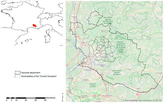 The Vaucluse department (Provence Alpes Cote d’Azur––PACA Region, France) is a typical Mediterranean region characterized by a strong presence of perennial crops, such as vineyards and orchards (currently around 60% of the total utilized agricultural area––UAA). It is a very heterogeneous area of more than 3600 km² going from the Avignon plain to the Mont Ventoux (1912 m above the see level––a.s.l.). Within the Vaucluse department, the French Comtat Venaissin (Figure 1) is bounded by three relief areas: Dentelles de Montmirail in the north, Mont Ventoux as its eastern extremity, and the beginning of Monts de Vaucluse in the southern part. This area includes 26 municipalities with a total of 93,518 inhabitants. The three main urban areas are Carpentras, Monteux, and Pernes-les-Fontaines, which are comprised of 50,926 inhabitants.