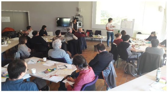 The second step of the local-scale methodology was based on a participative workshop, using the Territory Game methodology [,,]. The Territory Game is a research-action-training approach. It is a participative and collective learning system that allows us to design, concretize, and evaluate a territorial project, by facilitating stakeholders to express their representations of their territory []. This methodology was based on a principle of both spatialization and consensus: It involves stakeholders to represent geographically territorial current dynamics and possible future evolutions, after they all agreed with them.