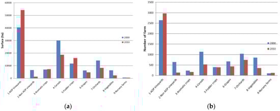 Aggregated farming system changes from 2000 until 2010 for the whole Vaucluse department in terms of (a) surface and (b) number of farms.