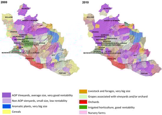 Figure 3 shows the total surfaces for each farming system in 2000 and 2010. The results showed a relevant increase on AOP vineyards and a decrease of the less specialized and rentable farming systems, such as cereal cultivation and table grapes usually cultivated in the mountain areas, which progressively reduced their surface. A specific dynamics observed in the study area was the increase of the number of farms and associated surface of the fodder and livestock farms. This corresponded to the new horse farms set up in the last few years in the region, associated to agro-tourism development. In some cases, i.e., for aromatic crops’ farms and fodder crops’ farms, the increase in terms of surface corresponded to a decrease in terms of farms’ number, indicating the concentration of land tended to be on bigger farms. The changes in terms of farming systems were also aggregated at the municipal level in order to spatialize them. The resulting maps are shown on Figure 4. In the Vaucluse department, we can identify three main areas of changes: (1) In the northwestern part, there was a shift from a diversified mixed farming system to a wine-specialized one, (2) in the central part, there was a decrease of the specialized orchards’ farms to more extensive/mixed ones, and (3) in the southern part, there was another area of specialization from mixed farming systems to specialized wine.