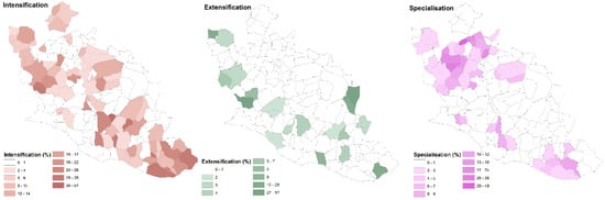 The observed trajectories were classified into three main groups: (1) From non-AOP vineyards to AOP vineyards, which could be considered as a specialization of the farming system; (2) from cereals’, orchards’, or mixed farming systems to AOP vineyards, which in some cases could be considered as an intensification of the farming system; and (3) from cereal and orchards to fodder crops and livestock, which was an extensification of the farming systems. These dynamics are represented on Figure 5 in terms of percentage of change by municipality. We can observe that the intensification process was spread through the whole department, with a stronger intensity in the southern part, which was characterized by more mixed and extensive systems. The extensification trajectory was quite localized in the peri-urban area of Avignon and it was mainly due to the development of horse livestock systems. The specialization process was mainly present in the northern part of the department and related to the wine production.