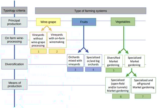 Based on stakeholders’ knowledge, we built a typology to identify the main farming systems in the area (Figure 6), and the first criterion of definition was the main type of production. The typology allowed identifying seven different farming systems: (1) Vineyards, without wine processing on the farm, that were generally part of a farmer cooperative. (2) Vineyards with wine making on the farm. (3) Orchards associated with vineyard: This is the typical and traditional “Ventoux farming system” combining table-grape, cherry, and wine-grape production. (4) Big and/or very specialized orchards that were specialized in one or two fruit productions and sell large volumes through long channels. It corresponded to fruit production systems that have generally enlarged or gotten very specialized in order to keep viable. (5) Diversified market gardening: It corresponded to farming systems that produce more than four kinds of vegetables within the year, and generally more than 10. (6) Specialized market gardening: It corresponded to farming systems that produce, in open-field and/or under nonheated tunnels, a maximum of four vegetables during the year, generally part of the main vegetables of the area (salad, strawberry, tomatoes, and melon). (7) Specialized market gardening with off-ground production: It is similar to the sixth type but part or all of the production was produce soil-free. This typology could be refined with two supplementary criteria: The production under organic certification or not for diversified market gardening systems, and the production under labelled designation of origin (French AOC or AOP) for vineyards.