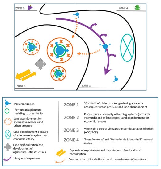 (1) The “comtadine” plain (zone 1) is the market gardening area. A strong peri-urbanization process is ongoing around the main villages, with a consequence of land abandonment because of urban pressure and land speculation. Nevertheless, there is also a process of resistance to urbanization with peri-urban agriculture and the emergence of some patches of market gardening in the urban zones. Peri-urbanization and agricultural infrastructures lead to land artificialization.