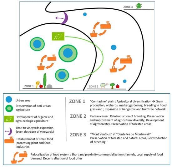 The vision that stakeholders imagined for their territory (Figure 8) and the propositions of action they formulated to achieve it were built around some general issues: (1) Improving agricultural, landscape, and biological diversity; (2) preserving and valuing agricultural land; (3) relocalizing food systems; 4) reinvigorating and preserving rural areas. In order to face territorial homogenization and specialization, stakeholders imagined a territory with stable vineyards for the benefit of a greater diversity of agricultural productions, also supported by the reintroduction of breeding in the area, by the preservation of traditional farming systems at the foot of Mont Ventoux, by the introduction of grain production in the plain, and by the valorization of unexploited agricultural areas through new productions (aromatic and medicinal plants, dry fruits, etc.). The desired agricultural development would promote a production that protects the environment and generates biodiversity, through the development of agroecology, agroforestry, and organic farming, and through the reinforcement of trees in landscape (restoration of hedges and the development of fruit trees’ hedges), in particular, to adapt to pressure on the water resource.