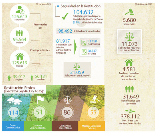 The current statistics on land restitution in Colombia. Source: https://www.restituciondetierras.gov.co/estadisticas-de-restitucion-de-tierras. Accessed 3 May 2020.