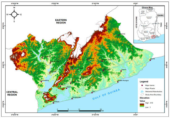 The study was conducted in the Greater Accra Metropolitan Area. It is geographically located on the South-East Coast of Ghana on the Gulf of Guinea, which forms part of the Atlantic Ocean. It extends from latitudes 5°5′27″ N to 5°28′2″ N and stretches between longitudes 0°4′58″ E to 0°37′2″ W (Figure 1). GAMA covers a total area of 1497 km2 and houses the capital city of Ghana (Accra) and the country’s most prominent seaport (Tema), making it the major economic and political hubof the country. It has experienced a rapid population growth due to natural increase and in-migration from other regions and the rural hinterland. Correspondingly, the area is characterised by a high population density with a population of 4.6 million people as of 2016 and an average growth rate of 3.5% per annum. Projected growth shows that by 2040, the population of GAMA will double to 10.5 million [35]. A direct implication of the foregoing is that the region will be under significant pressure to urbanise more in the coming years.