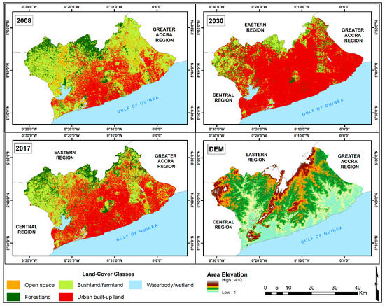 - Toure, S.I.; Stow, D.A.; Clarke, K.; Weeks, J. Patterns of land cover and land use change within the two major metropolitan areas of Ghana. Geocarto Int. 2018, 35, 209–223. [Google Scholar] [CrossRef]
