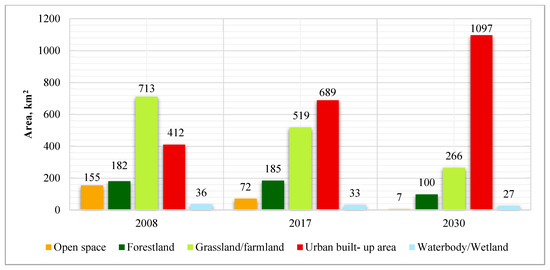 Figure 3 below illustrates the spatial area distribution of the land-cover types identified in the study area. Grassland/farmland was the dominant land-cover type as of 2008, whilst the built-up area increased by 277 km2 (67%) within the time period. This increase was largely due to the conversion of 83 km2 (54%) of open space and 194 km2 (27%) of grassland/farmland. Furthermore, the area of forestland and water body/wetland increased and decreased slightly by 5%. According to the predicted LCC distribution between 2017 and 2030, urban built-up area is likely to experience an increase of 408 km2 (59%). On the contrary, open space, forestland, grassland/farmland and water body/wetland may decrease by 65 km2 (90%), 86 km2 (46%), 253 km2 (49%) and 6 km2 (17%), respectively.
