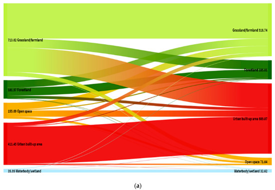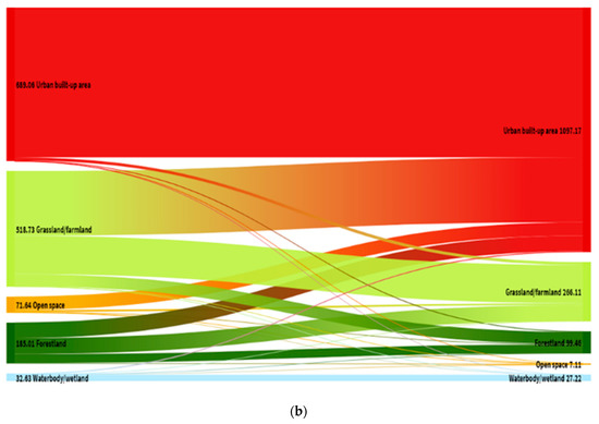 As depicted in Figure 4a, between 2008 and 2017 the extent of grassland/farmland declined from 713.02 km2 to 518.74 km2. The area covered by grassland/farmland transformed mainly into urban built-up area (239.04 km2) and forestland (90.11 km2). Despite this net increase, the area forestland had been converted. As much as 72.60 km2 and 26.61 km2 of forested area transitioned to grassland/farmland and urban built-up area respectively. Thirdly, the area covered by open space reduced substantially. About 65.02 km2 of open space transitioned to grassland/farmland, whilst 60.78 km2 were converted to urban built-up area. The obvious increase in urban built-up area is largely due to the conversion of grassland/farmland (239.04 km2), open space (60.78 km2) and forestland (26.61 km2). Quite interestingly, a total area of 50.9 km2 of urban built-up area transitioned into grassland (34.08 km2), open space (11.51 km2) and forestland (5.29 km2). Finally, although two-thirds of the water body/wetland area remained unchanged, a marginal extent (2.23 km2) transitioned into urban built-up.