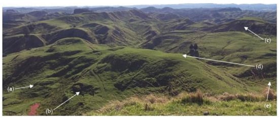 Hill country landscape: (a) earth flow; (b) slump/earth flow; (c) steep slopes > 25°; (d) flat topped ridges; (e) hilly slopes 15–25°. Photographed by Duy X. Tran in 2019.