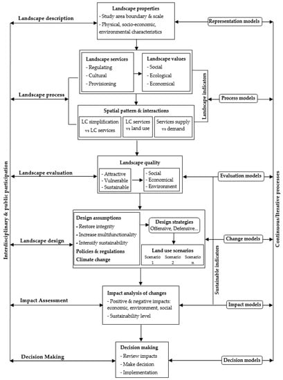 Six models are employed to answer each of the six questions, ranging from the description of the study area to the decision on a desired future landscape. The process presented in the framework is an integrated and continuous procedure, because the outcome of each phase serves as an input for the subsequent phase, and all the stages of the design (understand study area, specify methods and perform study) are incorporated into one unified system.