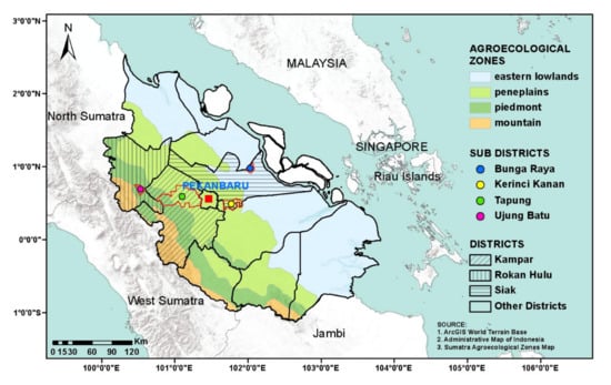 Riau Province, Indonesia, showing agro-ecological zones, district and sub-district boundaries, and the four study sites—Bunga Raya, Kerinci Kanan, Tapung, and Ujung Bat.