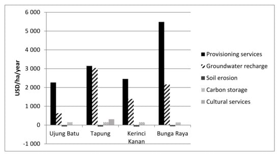 The TEVs of the ecosystem services are illustrated in Figure 2. This figure exhibits clearly the marked differences between marketed (provisioning) and non-marketed (regulating and maintenance, and cultural and amenity) services in all villages except Tapung. These differences are probably lower than Figure 2 indicates because not all non-marketed services were identified by farmers and, therefore, were not included in the calculations. Groundwater recharge is high in all villages except Ujung Batu, while the economic values of soil erosions, carbon storage, and cultural services are relatively low compared to both provision services and groundwater recharge.