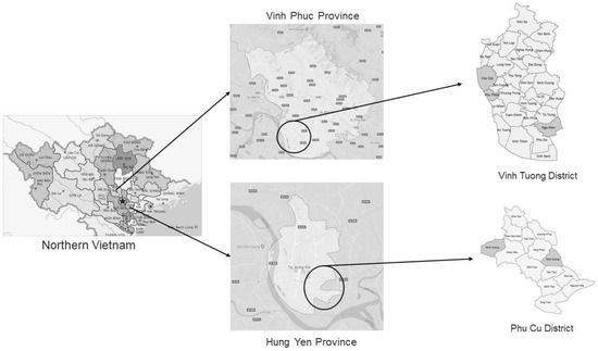 We especially acknowledge the kind help of the People’s Committee of Phu Cu district (Hung Yen province) and Vinh Tuong district (Vinh Phuc province), and the People’s Committee of Nhat Quang commune, Minh Hoang commune (Phu Cu district), Cao Dai commune, Ngu Kien commune, Phu Thinh commune (Vinh Tuong district), and for providing us the necessary local socio-economic data and documents. We also would like to convey our thankfulness to the local people in these communes for accepting to join our household interviews and giving us initial information for the research.