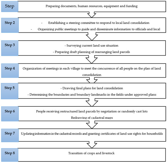 Land consolidation in the case studies was generally conducted in 8 steps (Figure 2). While local governments, from the province level to the commune level, conduct the first step, local governments from the commune level to the village level, including a steering committee elected by the people’s committee of a commune, are primarily responsible for creating a detailed plan for land consolidation and then implementing that plan in each subsequent step.