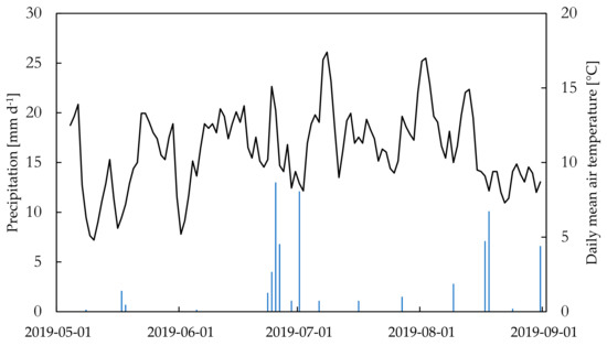 Daily accumulated precipitation (blue bars) and daily mean air temperature (black line) for the 2019 growing season measured at Narsarsuaq.