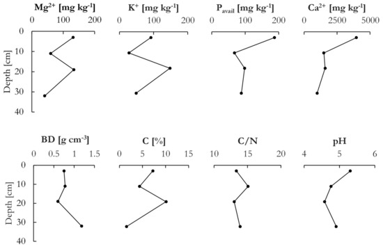 Mg, K and Pavail were present in bulks of almost equal amount of approximately 250 kg ha−1. The soil contained a stock of almost five tons of Ca per hectare and 55 kg of Na per hectare. N and C were present in copious amounts of 13 t N and 173 t C ha−1, respectively.