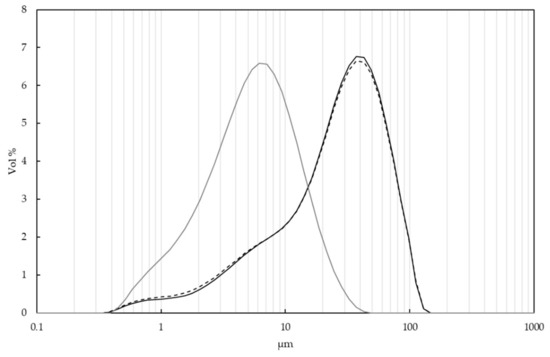 Particle size distribution of glacial rock flour (GRF) primary particles (grey line), T1 (solid black line), and T2 (dashed black line). The distributions were constructed as an average of five replicates measured five times using a Malvern Mastersizer 2000. No error bars are shown, as the standard deviations were small and concealed the small difference between T1 (control) and T2.